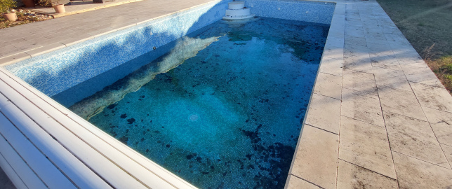 Avant travaux d'une piscine carrelée avec fuites sur le cuvelage et la tuyauterie